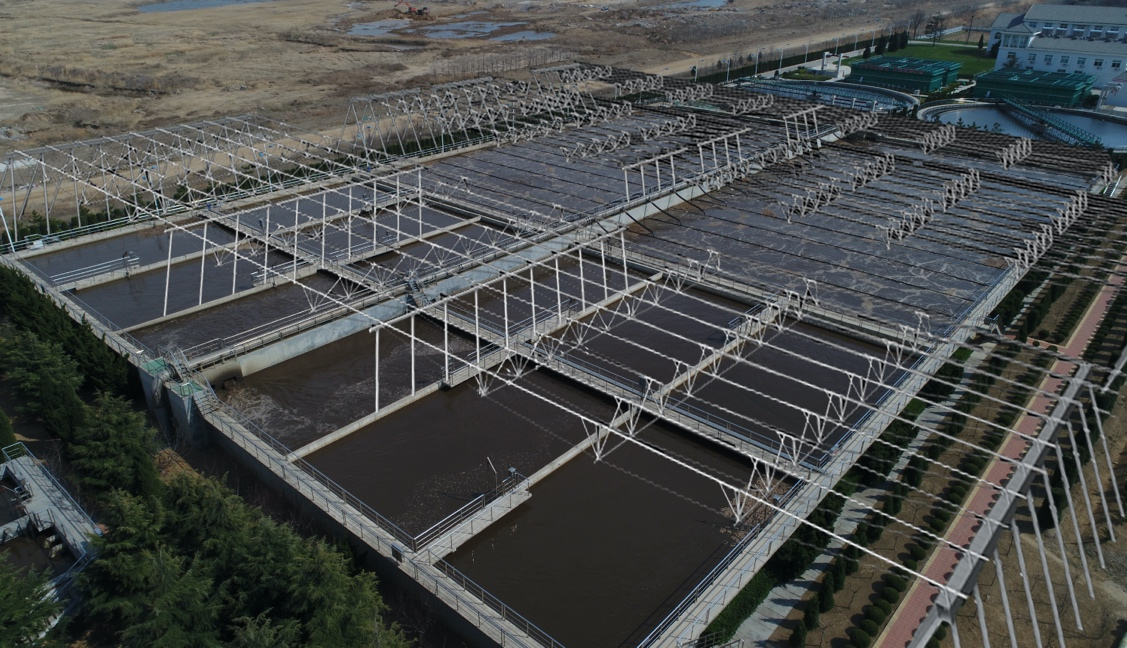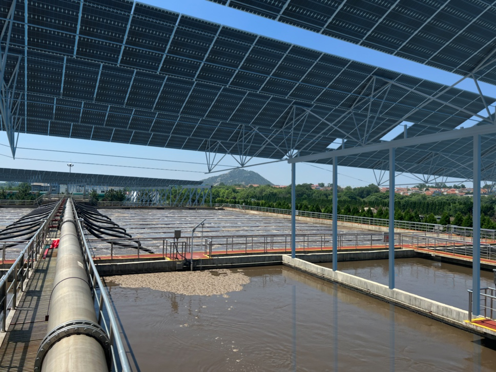 “光伏+水務(wù)”示范項(xiàng)目在榮成水務(wù)第二污水處理廠并網(wǎng)發(fā)電。項(xiàng)目利用污水廠氧化溝水池上方空間排布光伏板,在污水廠上面布設(shè)光伏板除了能獲取綠色電力外,還能遮擋陽光,有效抑制池內(nèi)水體藻類的生產(chǎn),提高污水處理效率,提升入海水質(zhì),屬實(shí)是一舉多得的方案。