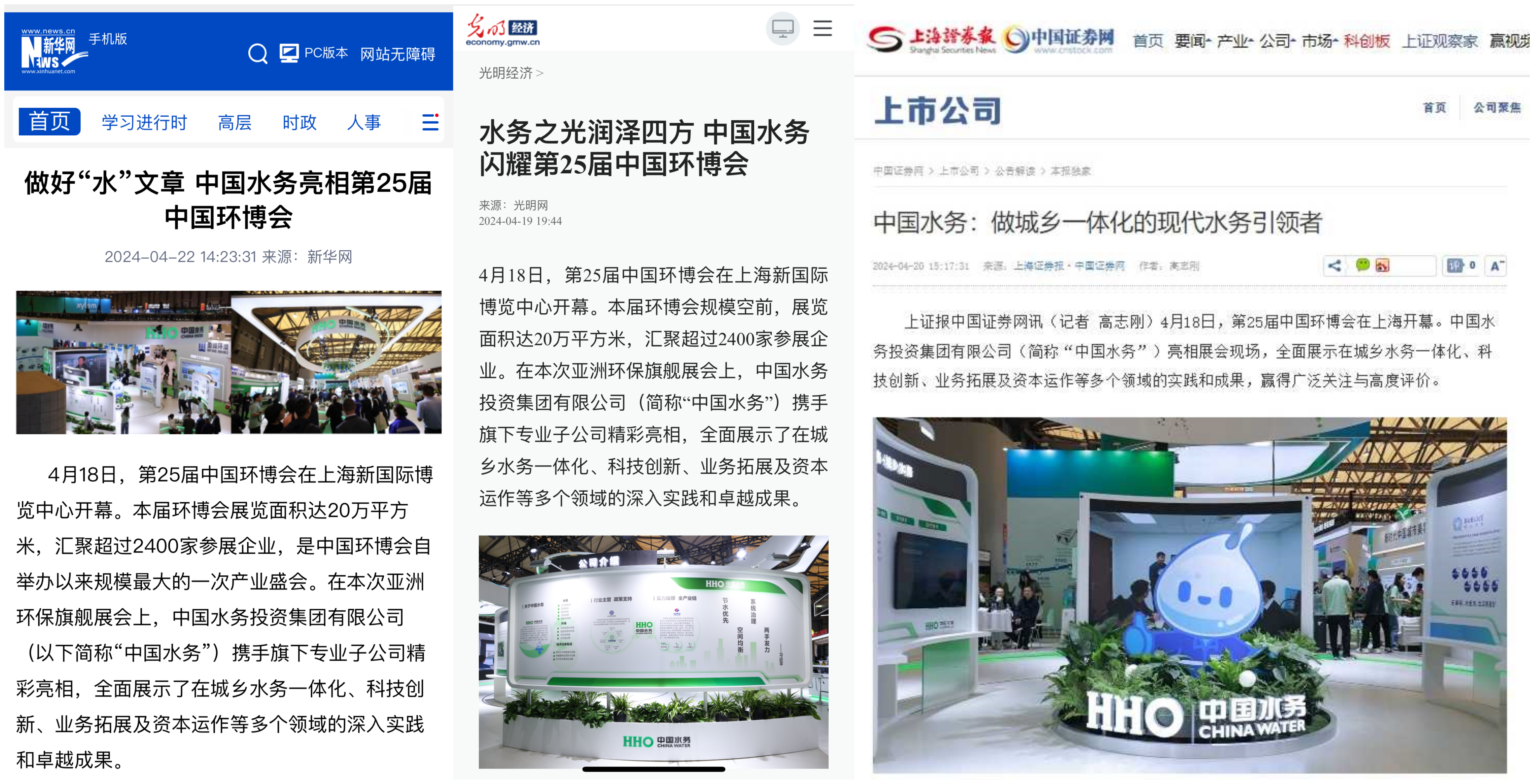 4月18日-20日,亞洲范圍內最具影響力、最高品質的旗艦環(huán)保展——第25屆中國環(huán)博會(IE expo China 2024)在上海新國際博覽中心舉辦,中國水務投資集團有限公司攜下屬單位共同亮相環(huán)博會。人民網(wǎng)、新華網(wǎng)、光明網(wǎng)、中國經(jīng)濟網(wǎng)、中國環(huán)境報、上海證券報等多家中央媒體紛紛跟進報道。