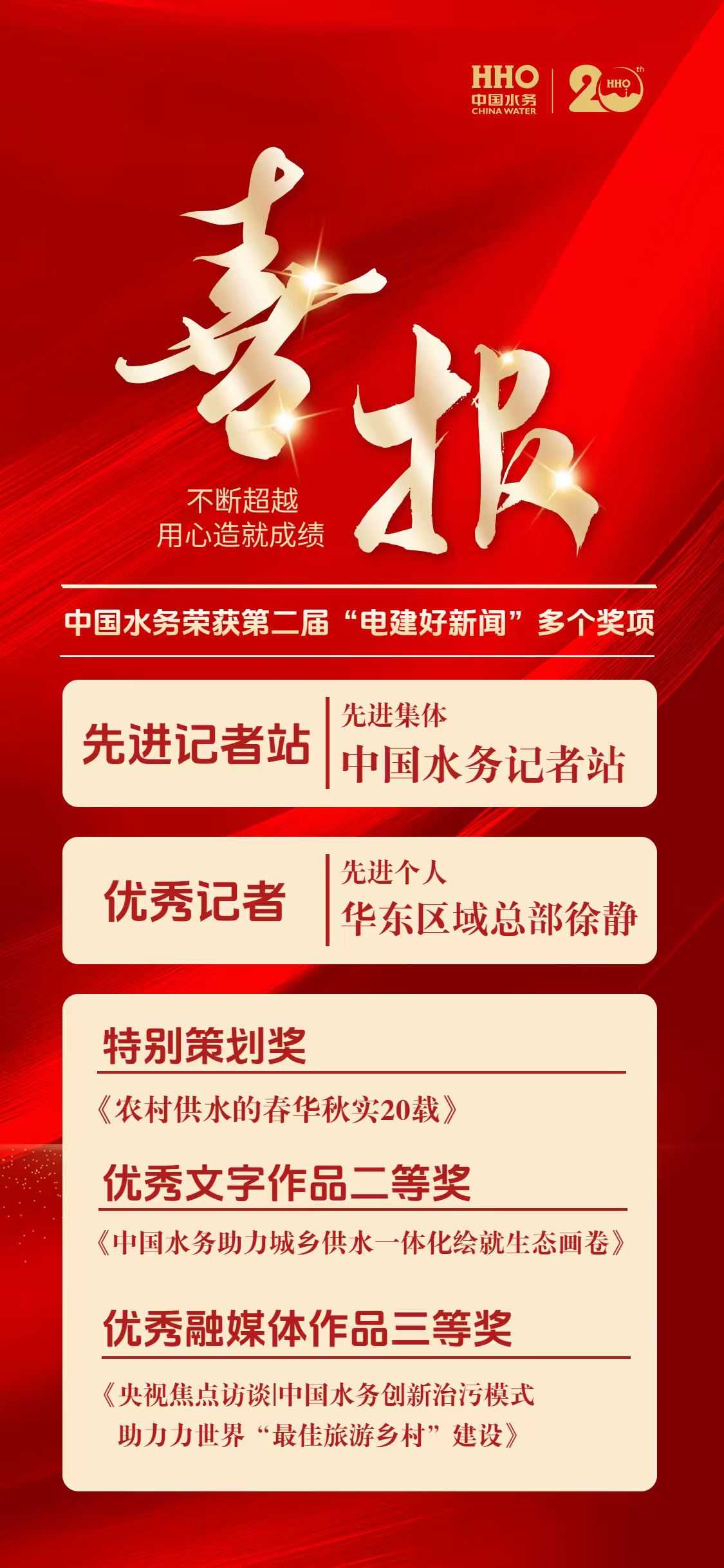 在第二屆“電建好新聞”評(píng)選中,中國(guó)水務(wù)榮獲“先進(jìn)記者站”,華東區(qū)域總部徐靜榮獲“優(yōu)秀記者”,《農(nóng)村供水的春華秋實(shí)20載》榮獲特別策劃獎(jiǎng),《中國(guó)水務(wù)助力城鄉(xiāng)供水一體化繪就生態(tài)畫卷》榮獲優(yōu)秀文字作品二等獎(jiǎng),《央視焦點(diǎn)訪談|中國(guó)水務(wù)創(chuàng)新治污模式助力世界“最佳旅游鄉(xiāng)村”建設(shè)》榮獲優(yōu)秀融媒體作品三等獎(jiǎng),全面展現(xiàn)了公司深化改革、創(chuàng)新發(fā)展的顯著成效,為高質(zhì)量發(fā)展注入強(qiáng)勁文化動(dòng)能。