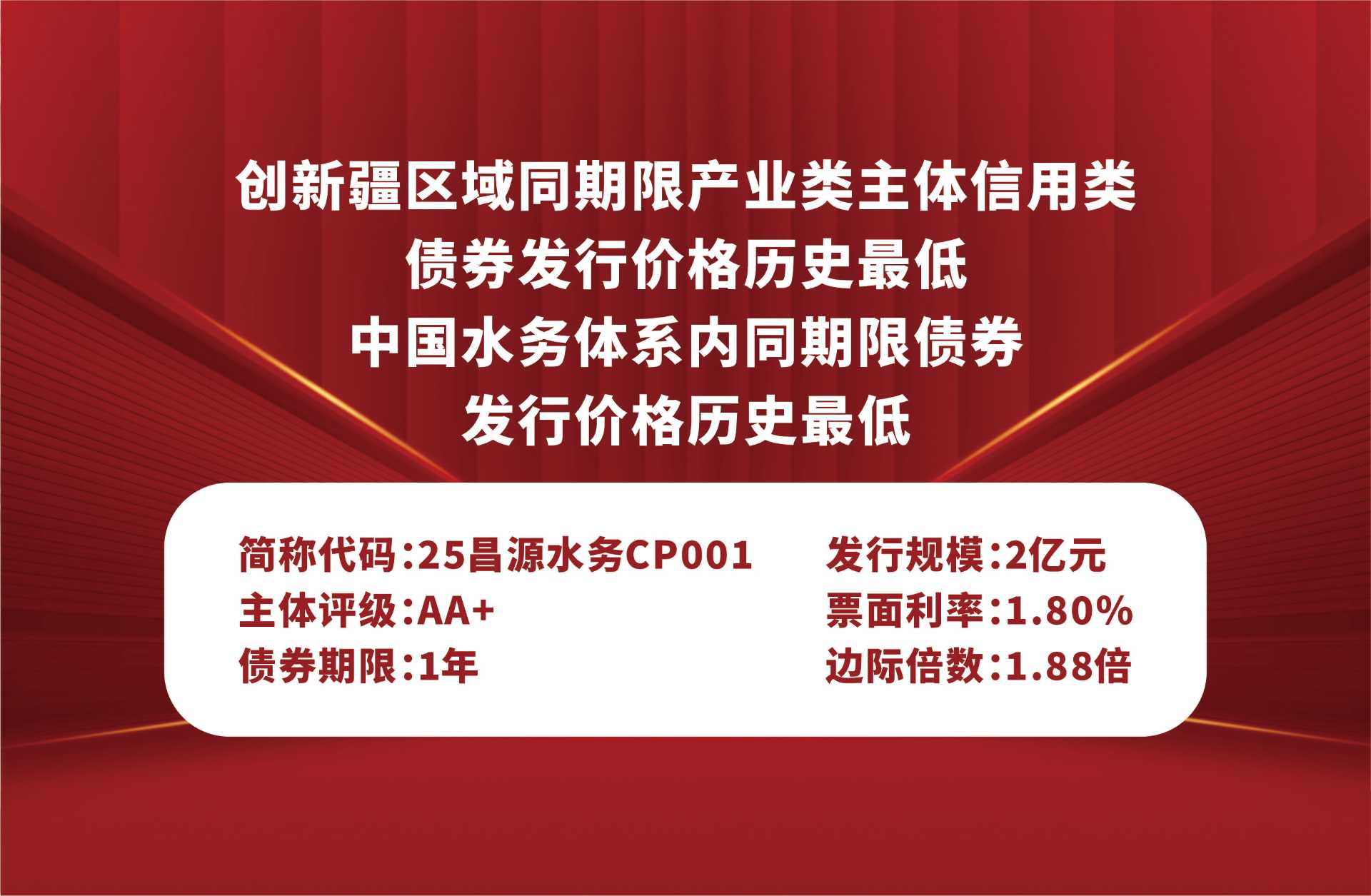 12月1日,昌源水務(wù)順利完成2025年度第一期短期融資券發(fā)行,發(fā)行規(guī)模2億元。此次發(fā)行創(chuàng)下兩項歷史新低——新疆區(qū)域同期限產(chǎn)業(yè)類主體信用類債券發(fā)行價格最低、中國水務(wù)體系內(nèi)同期限債券發(fā)行價格最低,充分彰顯了資本市場對中國水務(wù)賦能成效及昌源水務(wù)綜合實力的高度認(rèn)可。