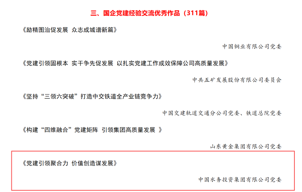 近日,《國企》雜志對2025年度所刊載的文章按國企黨建理論研究、國企黨建工作研究、國企黨建經(jīng)驗交流、國企黨建宣傳報道4大類進行了評審,依據(jù)文章選題、撰稿規(guī)范、文章質(zhì)量、影響力等質(zhì)量評審要素,評選出優(yōu)秀作品486篇。中國水務(wù)多部黨建成果獲評2025年度優(yōu)秀作品。其中,中國水務(wù)黨委報送的《黨建引領(lǐng)聚合力 價值創(chuàng)造謀發(fā)展》獲評“國企黨建經(jīng)驗交流優(yōu)秀作品”。