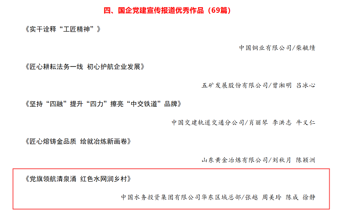 中國水務(wù)所屬華東區(qū)域總部報送的《國有水務(wù)企業(yè)干部人才工作的“雙向培養(yǎng)”路徑與實踐價值》獲評“國企黨建工作研究優(yōu)秀作品”、《黨旗領(lǐng)航清泉涌 紅色水網(wǎng)潤?quán)l(xiāng)村》獲評“國企黨建宣傳報道優(yōu)秀作品”,充分展現(xiàn)了中國水務(wù)在深化黨建理論研究、推動黨建工作實踐創(chuàng)新方面的顯著成效。