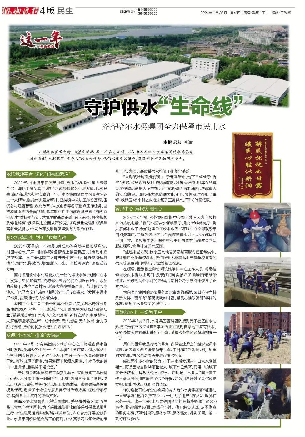 1月25日,鶴城晚報報道齊齊哈爾水務(wù)集團2023年保障供水的各項舉措。作為齊齊哈爾市民生保障企業(yè),齊水集團肩負著居民生活用水、企業(yè)生產(chǎn)用水的服務(wù)保障任務(wù)。他們以優(yōu)質(zhì)的服務(wù),默默守護市民的用水安全,不僅為齊水集團的年終答卷增光添彩,也彰顯了“水務(wù)人”的擔當精神。