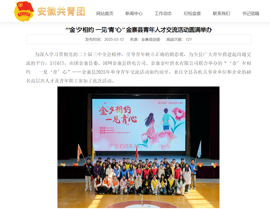近日,安徽共青團官方網(wǎng)站報道華東區(qū)域總部下屬金寨金葉供水有限公司與團金寨縣委、國網(wǎng)金寨縣供電公司聯(lián)合舉辦的“‘金’夕相約 一見‘青’心”青年人才交流活動。本次活動匯聚了全縣48名來自不同機關(guān)事業(yè)單位及企業(yè)的杰出青年人才與職工,搭建了一個跨領(lǐng)域、深層次的交流平臺,有效促進跨行業(yè)青年間的交流與合作。
