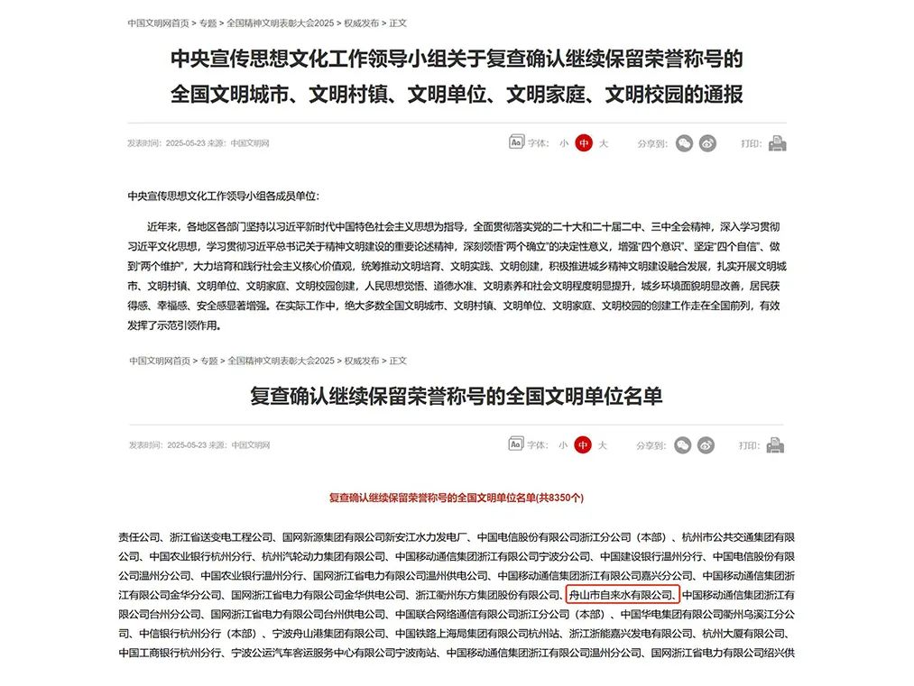 近日,全國精神文明建設(shè)表彰大會在北京召開,中央宣傳思想文化工作領(lǐng)導(dǎo)小組公布了《第七屆全國文明單位名單》和《復(fù)查確認繼續(xù)保留榮譽稱號的全國文明單位名單》。中國水務(wù)所屬錢江水利舟山水司繼續(xù)保留“全國文明單位”榮譽稱號,這也是舟山水司連續(xù)五屆蟬聯(lián)該稱號。