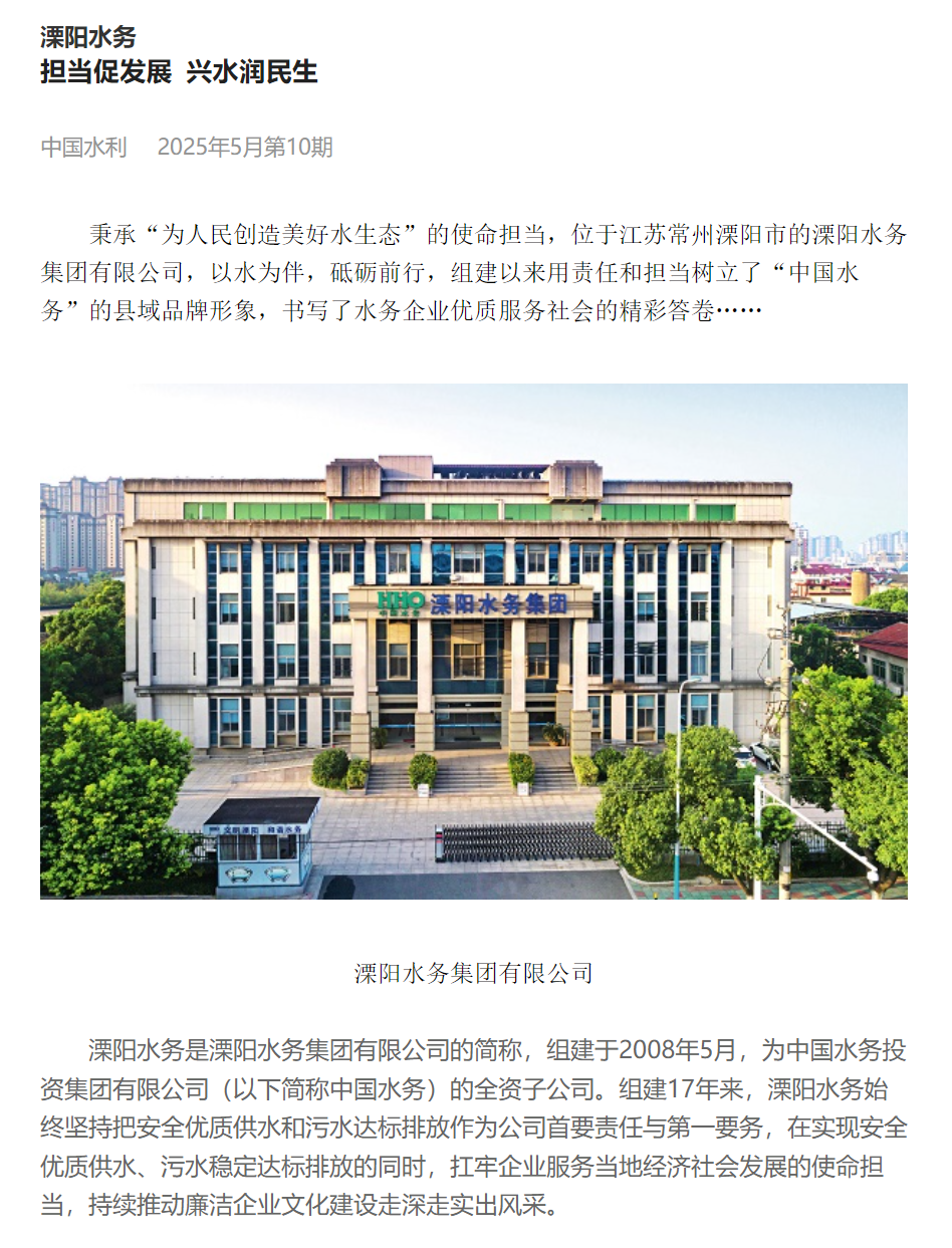近日,《中國水利》雜志以《擔當促發(fā)展 興水潤民生》為題對中國水務(wù)所屬華東區(qū)域總部溧陽水務(wù)秉承“為人民創(chuàng)造美好水生態(tài)”的使命擔當,奮力書寫水務(wù)企業(yè)優(yōu)質(zhì)服務(wù)社會的精彩答卷進行了報道。