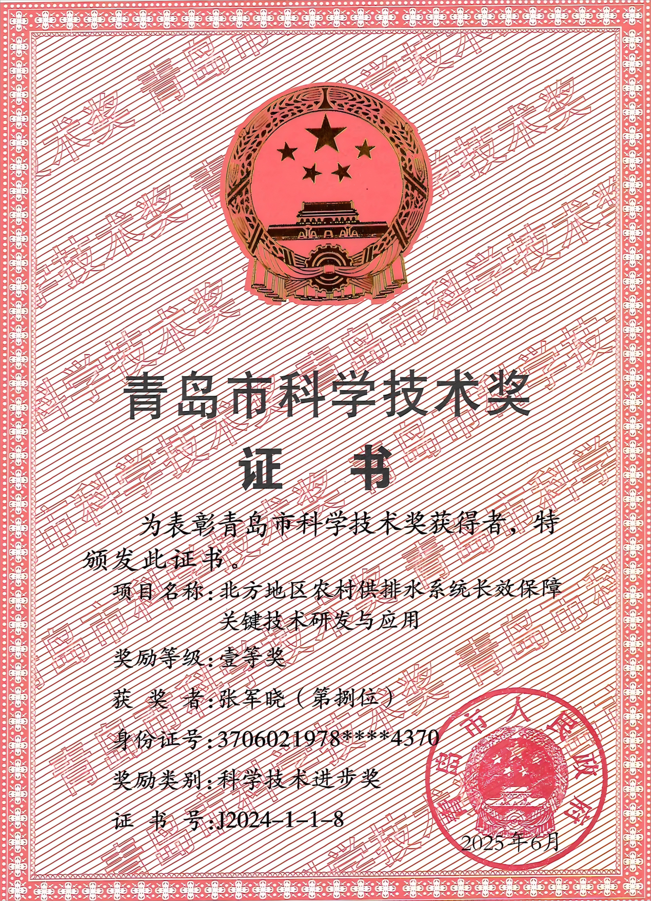 近日,青島市人民政府公布2024年度青島市科學(xué)技術(shù)獎(jiǎng)獲獎(jiǎng)名單。由青島理工大學(xué)牽頭,榮成市水務(wù)集團(tuán)有限公司、中國(guó)市政工程中南設(shè)計(jì)研究總院有限公司等單位共同完成的“北方地區(qū)農(nóng)村供排水系統(tǒng)長(zhǎng)效保障關(guān)鍵技術(shù)研發(fā)與應(yīng)用”項(xiàng)目,榮獲科學(xué)技術(shù)進(jìn)步獎(jiǎng)一等獎(jiǎng),榮成水務(wù)黨委委員、副總經(jīng)理、工會(huì)主席張軍曉作為項(xiàng)目組主要成員同獲殊榮。