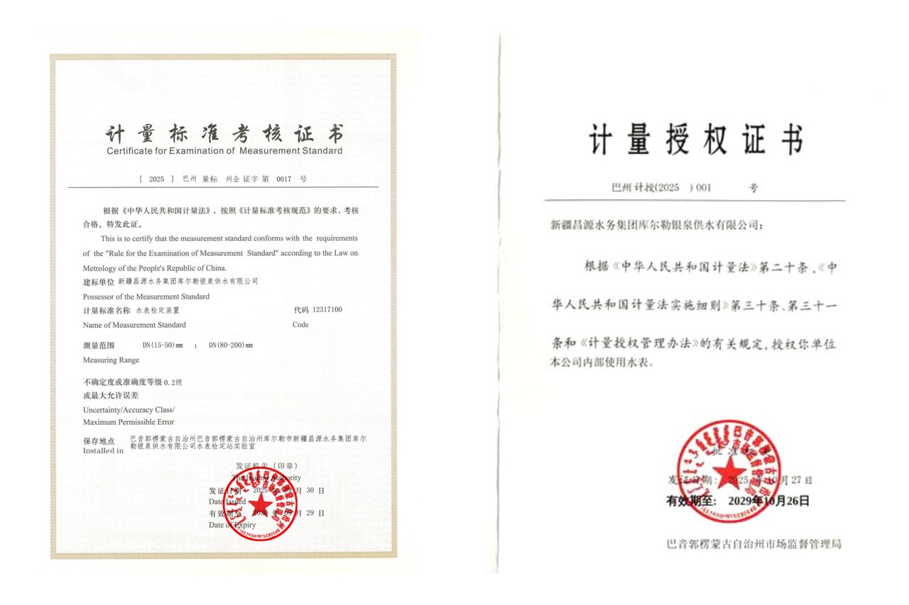 近日,昌源集團(tuán)庫(kù)爾勒銀泉供水公司傳來喜訊,成功獲得新疆巴音郭楞蒙古自治州市場(chǎng)監(jiān)督管理局頒發(fā)的《計(jì)量標(biāo)準(zhǔn)考核證書》及《計(jì)量授權(quán)證書(內(nèi)部)》。這項(xiàng)資質(zhì)的取得,標(biāo)志著銀泉供水公司在水表計(jì)量檢定領(lǐng)域?qū)崿F(xiàn)新的突破,為公司高質(zhì)量發(fā)展注入強(qiáng)勁動(dòng)力,也為保障區(qū)域供水計(jì)量精準(zhǔn)性奠定堅(jiān)實(shí)基礎(chǔ)。
